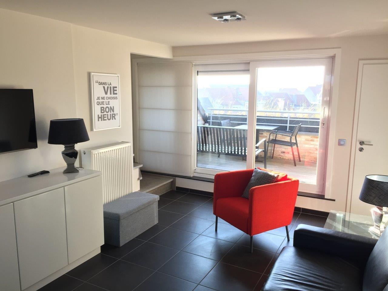 Modern duplexappartement op het 4 en 5de verdiep met zuidgericht zonneterras gelegen vlakbij het natuurgebied 'De Houtsaeger' en op 500 meter van het strand.