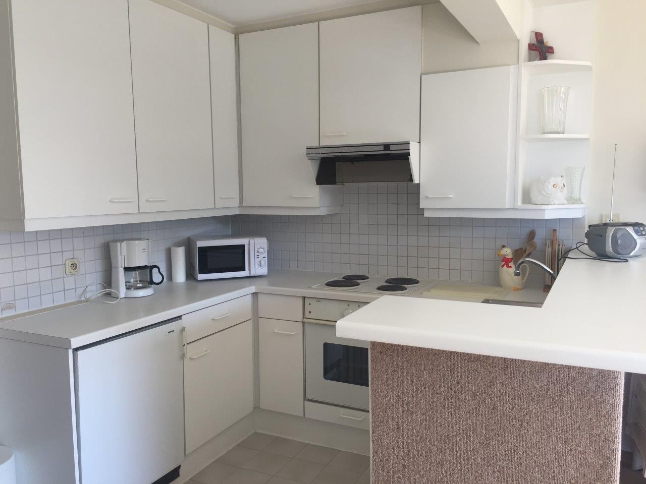 Bestaat uit I inkomhall met apart toilet, grote woonkamer met open keuken en zonnig terras, badkamer met inloopdouche, lavabo en toilet, 1 slaapkamer met dubbel bed en de andere met 2 enkele bedden.
