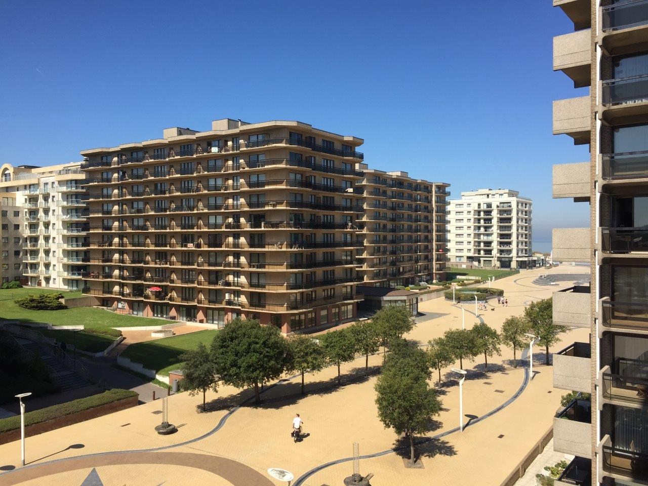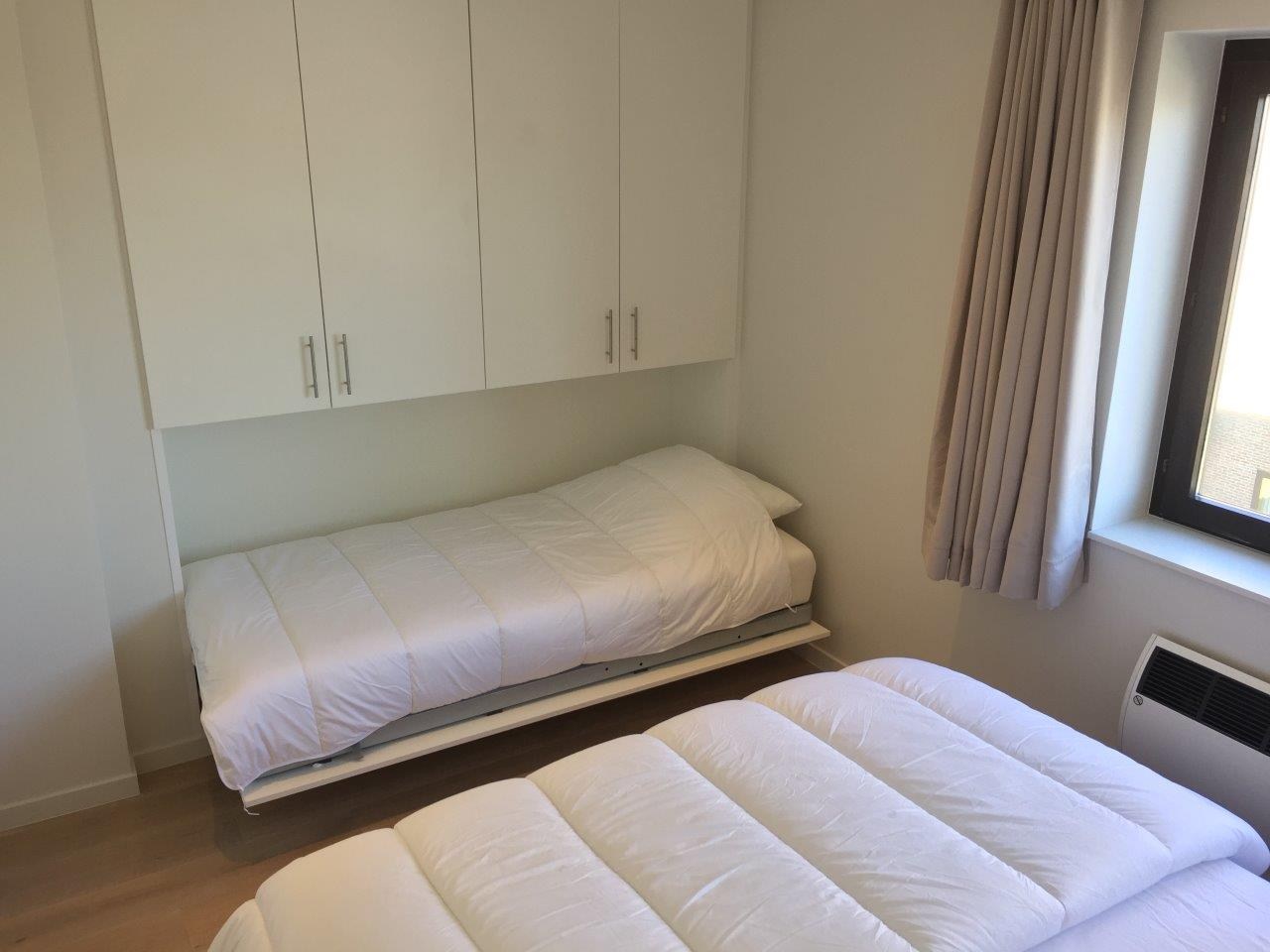 Bestaat uit I inkomhal met apart toilet, zonnige woonkamer met open keuken en zicht op het Esplanadeplein. 1 slaapkamer met dubbel en enkel bed en 1 slaapkamer met dubbel bed. Badkamer met inloopdouche en lavabo.